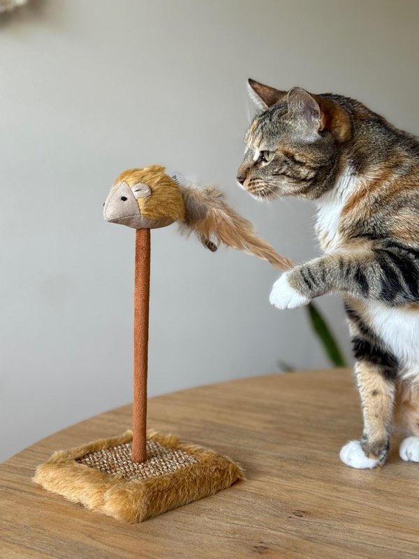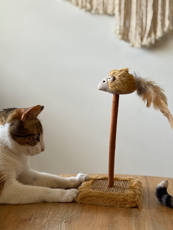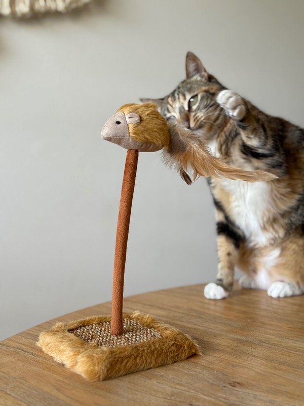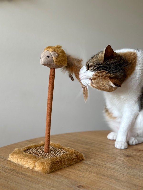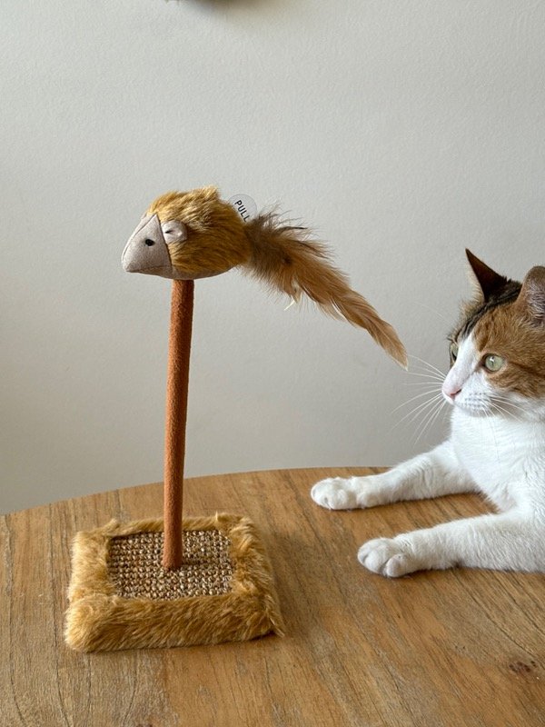 Este divertido juguete con base estable tiene una varilla flexible que se mueve hacia todos lados y hace sonido de ratita cuando tu gato lo toca.