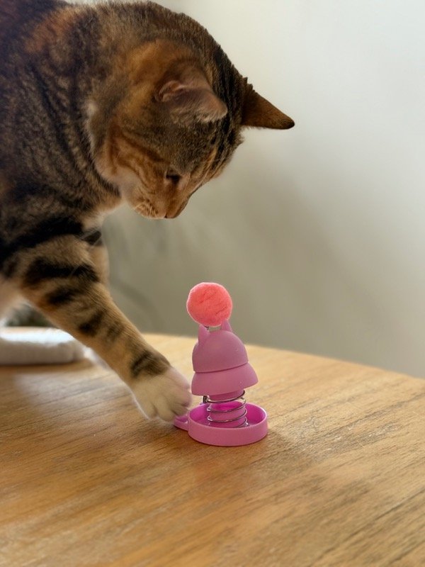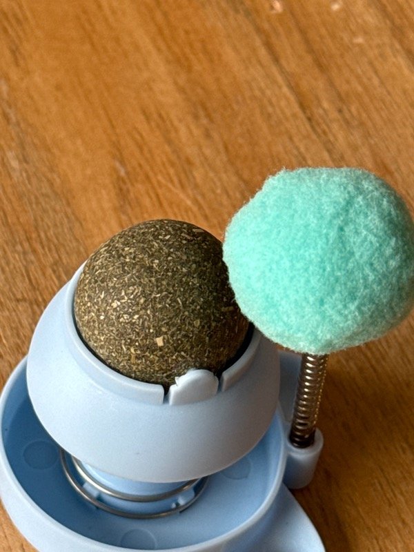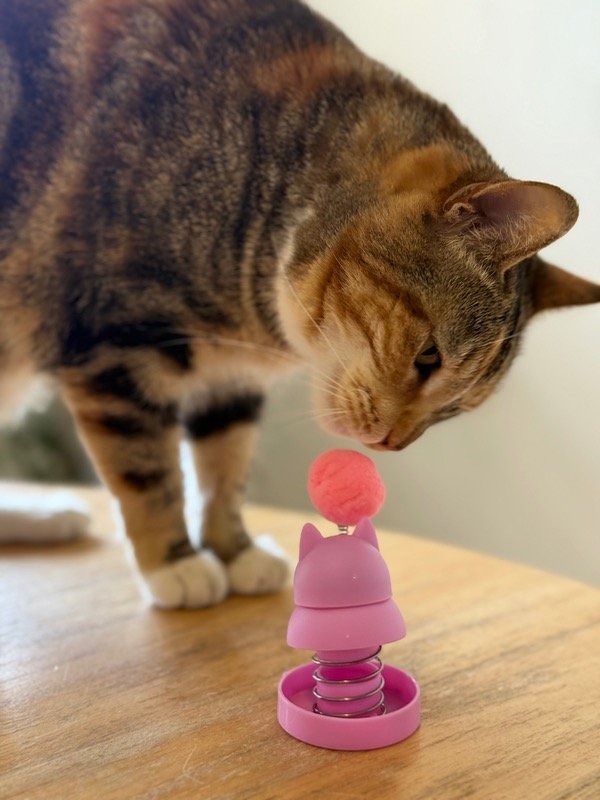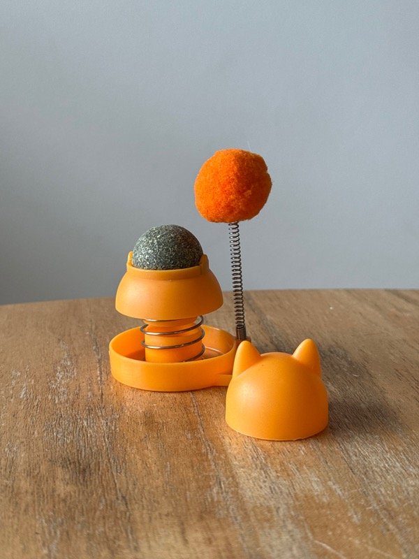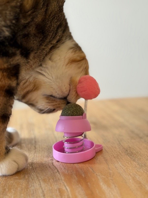 Divertido juguete interactivo para gatos, ideal para estimular su curiosidad y mantenerlos activos. Su diseño incluye una base con ventosa que se adhiere fácilmente a superficies lisas como paredes, pisos o ventanas.