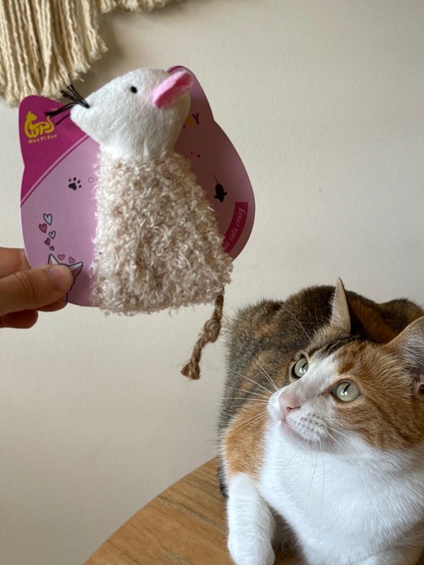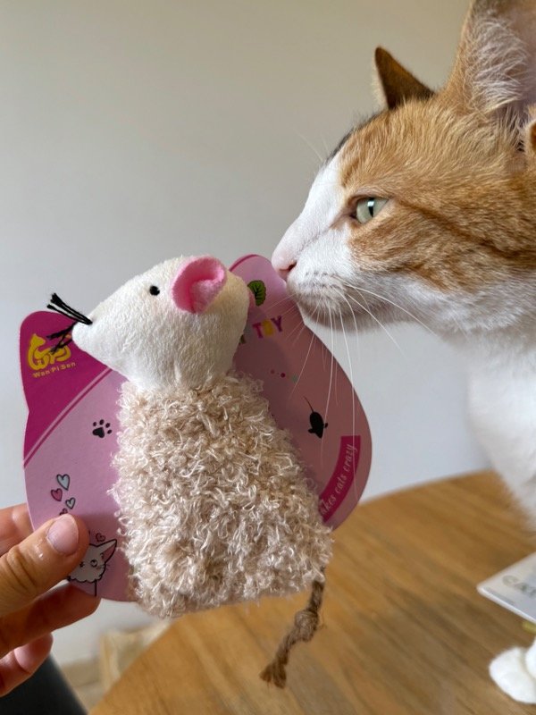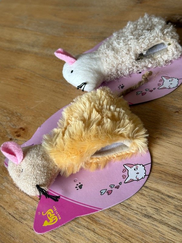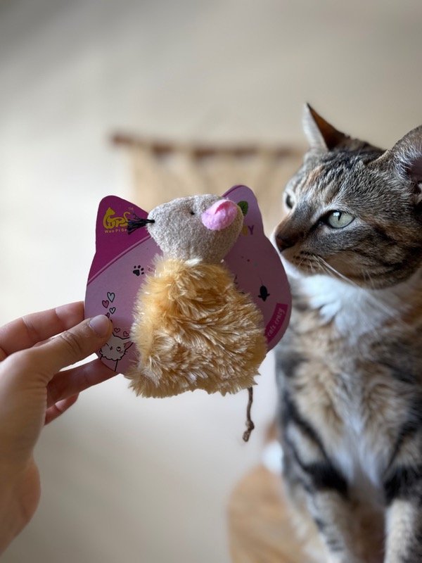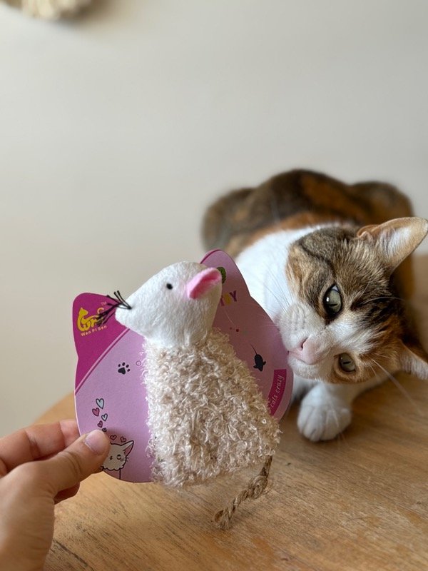 Ratita de peluche rellena con catnip natural, ideal para estimular el instinto cazador de tu gato.